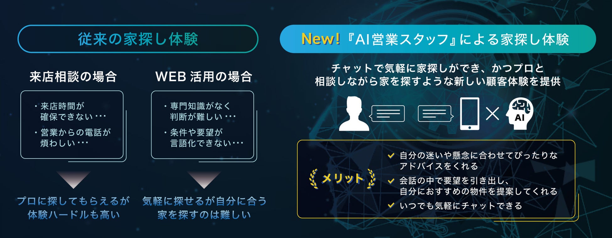 「AI営業スタッフ」では、お客様に合わせて必要な情報を自動でパーソナライズし、またお客様が能動的に言語化・判断をせずとも、質問に答えていくだけで自分に合った家探しが進みます。これにより、あたかもプロの営業スタッフと相談しながら家探しをするような、新たな顧客体験を実現してまいります。